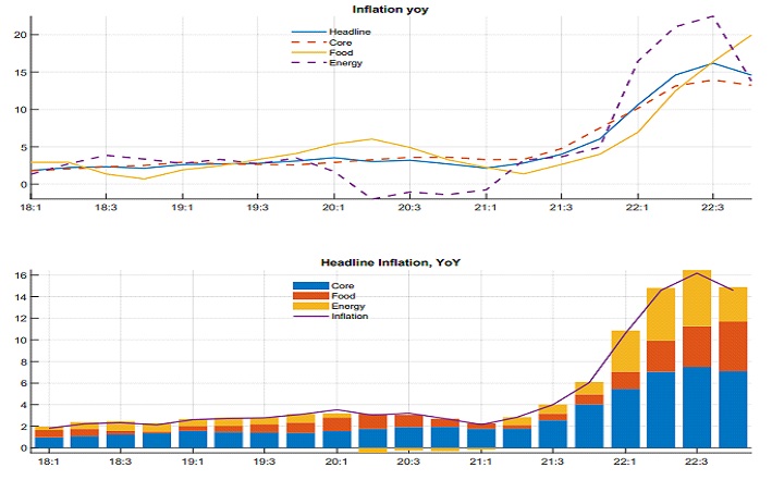 უცხოური მოთხოვნა 2022 წლის დასაწყისში მაღალი იყო, რაც კიდევ უფრო ზრდიდა ინფლაციურ ზეწოლას. პანდემიის დროს მიწოდების ჯაჭვები დაზიანდა, რამაც გამოიწვია პოტენციური გამოშვების შემცირება(Beneš & N’Diaye, 2004). როგორც ნაჩვენებია ნახაზზე 1, გამოშვება მე-4 კვარტალში პოტენციალს აღემატებოდა. ეს მიუთითებს, რომ ინფლაციური ზეწოლა ძირითადად განპირობებული იყო ჭარბი მოთხოვნით (იხ. ნახაზი 1). ნახაზი 1 გამოშვების გადახრის დეკომპოზიცია და დადებითი მოთხოვნის შოკი წყარო: ნახაზი აგებულია პროგრამა MATLAB-ის გამოყენებით. ჩეხეთში 2022 წელს ევროპაში ერთ-ერთი ყველაზე მაღალი ინფლაციის მაჩვენებელი დაფიქსირდა. მიუხედავად იმისა, რომ ზოგადი ინფლაცია მე-4 კვარტალში ოდნავ შემცირდა (16.2%-დან დაახლოებით 15%-მდე), ის მნიშვნელოვნად აღემატებოდა 2%-იან თარგეთს. ინფლაციის გამომწვევი მიზეზები იყო: ძირითადი ინფლაცია (მომსახურება, სამრეწველო საქონელი), რაც ასახავდა მოთხოვნის მხრიდან ზეწოლას; სურსათისა და ენერგიის ფასები, რომლებზეც დიდ გავლენას ახდენდა გლობალური საქონლის ტენდენციები და გეოპოლიტიკური გაურკვევლობა; იმპორტირებული ინფლაცია, რომელიც ნაწილობრივ შემსუბუქდა გაცვლითი კურსის გაძლიერებით. როგორც ნაჩვენებია ნახაზზე 2, ძირითადი ინფლაცია მუდმივად მაღალი რჩებოდა, მაშინაც კი, როდესაც ენერგიის ფასების ინფლაცია შესუსტდა. ნახაზი 2 ინფლაციის შემადგენლობა სექტორების მიხედვით (წლიური) წყარო: ნახაზი აგებულია პროგრამა MATLAB-ის გამოყენებით. ჩეხეთის ცენტრალურმა ბანკმა რეაგირება მოახდინა პოლიტიკის საპროცენტო განაკვეთის 7%-მდე გაზრდით 2022 წლის დასაწყისში, ხოლო მე-4 კვარტლისთვის რეკომენდებული იყო შემდგომი გამკაცრება 1 პროცენტული პუნქტით, 8%-მდე. მიუხედავად ამ ნომინალური ზრდისა, რეალური საპროცენტო განაკვეთი უარყოფითი რჩებოდა უკიდურესად მაღალი ინფლაციის გამო, როგორც ეს ნაჩვენებია ნახაზზე 3. ნახაზი 3 ნომინალური და რეალური საპროცენტო განაკვეთები დროთა განმავლობაში წყარო: ნახაზი აგებულია პროგრამა MATLAB-ის გამოყენებით. ამავდროულად, ჩეხეთის ცენტრალურმა ბანკმა გამოიყენა სავალუტო ინტერვენციები ვალუტის გაუფასურების საწინააღმდეგოდ. 2022 წელს ჯამში 25.5 მილიარდი ევროს ოდენობის სავალუტო ინტერვენციები განხორციელდა — რაც ხაზს უსვამს ცენტრალური ბანკის რეაქციის მასშტაბს ადგილობრივი ვალუტის დასაცავად და იმპორტირებული ინფლაციის შესაზღუდად. მიუხედავად იმისა, რომ სავალუტო ინტერვენციებმა ხელი შეუწყო გაცვლითი კურსის სტაბილიზაციას, მას თან მოჰყვა რისკები მონეტარული პოლიტიკის გამჭვირვალობის მიმართ და შეირყა ს